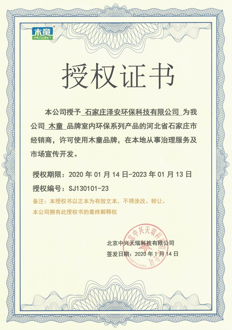 木童除甲醛石家莊代理商授權(quán)證書